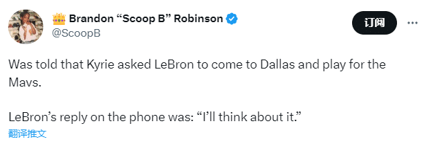 来源:JRS直播网06-08 12:12JRS直播网讯06月08日近日欧文招募詹姆斯加盟独行侠的重磅消息引发巨大热议,究竟当时詹姆斯是如何回应欧文的?NBA名记布兰登-罗宾逊爆料,当欧文招募詹姆斯前往独行侠打球时,詹姆斯在电话里回应:我会考虑的(I’ll think about it)。