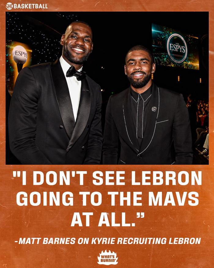 对于欧文招募詹姆斯的流言,前NBA球员马特-巴恩斯在节目中表示:当我听到这个时,我的第一想法就是,独行侠是卢卡的球队而非欧文的。但这则流言出来的时候,或许它根本就是事实,而湖人的回应则是,除非独行侠用卢卡来换,这么说的话我们也就都知道了,这样的交易不会发生。我也觉着,詹姆斯肯定不会去独行侠。