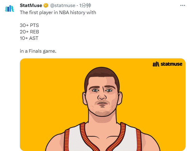 6、约基奇成为NBA史上第一位在总决赛拿到30+20+10三双的球员 7、约基奇成历史第一位在前三次总决赛中2次拿到三双的球员8、约基奇生涯第3次在季后赛中砍下30+20+10,而在NBA季后赛历史中,除了约基奇之外,一共只出现过两次单场30+20+10的表现,分别是贾巴尔和张伯伦各一场。