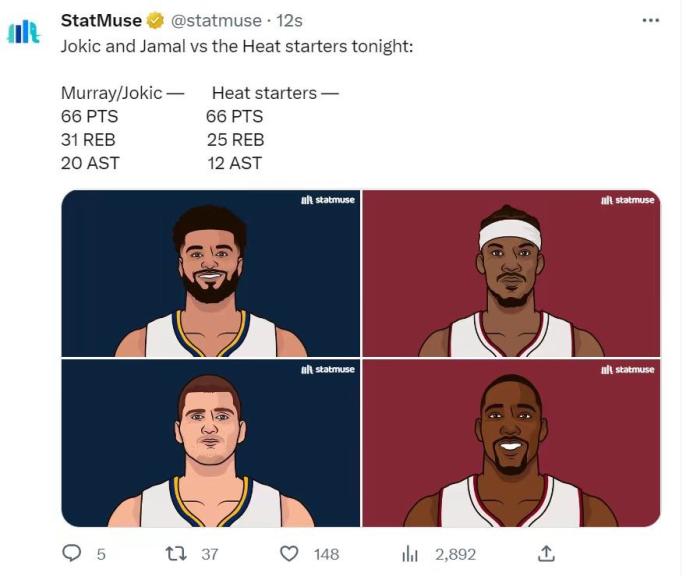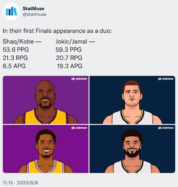 约基奇和穆雷G3合砍66分31篮板20助攻,而热火首发五虎加起来拿到66分25篮板12助攻,掘金双星的表现压制热火首发五人;美媒StatMuse还对比了约基奇&穆雷和OK组合首次总决赛之旅的场均数据——科比&奥尼尔首次总决赛场均合砍53.6分21.3篮板6.5助攻;约基奇&穆雷首次总决赛场均合砍59.3分20.7篮板19.3助攻。