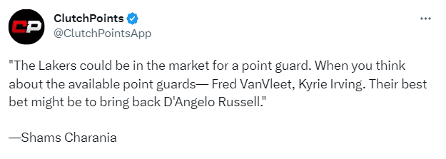 除了浓眉续约的话题外,湖人该不该续约拉塞尔也是一个问题,名记shams谈到湖人今夏潜在的操作,表示:湖人可能会在市场上寻找一名控卫。你想想市场上有哪些控卫呢——范弗里特、欧文。他们最佳选择可能是签回拉塞尔。