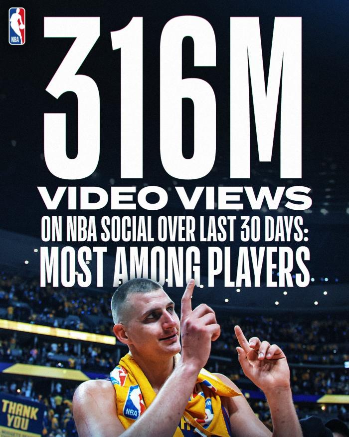 上赛季,约基奇在NBA社交媒体平台上的视频观看量在所有球员中排名第18位,这个赛季常规赛,他上升到了第9位。