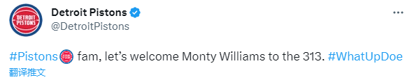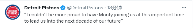 蒙蒂还表示:活塞队做出了承诺,当我们讨论这支球队和集体目标时,我意识到这将是我帮助一支才华横溢的年轻球队并在底特律建立强大文化的绝佳机会,这显然是一个有着深厚篮球历史的特殊地方,我和我的家人都期待着有机会成为这个城市和组织的一员。