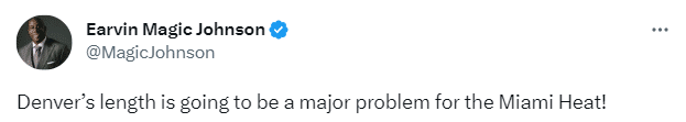 掘金第一场赢得太轻松,湖人名宿魔术师复盘总决赛G1,发推列出约基奇、穆雷、戈登、小波特和布朗的数据,还写道:丹佛的身高将成为迈阿密热火的一个大麻烦!