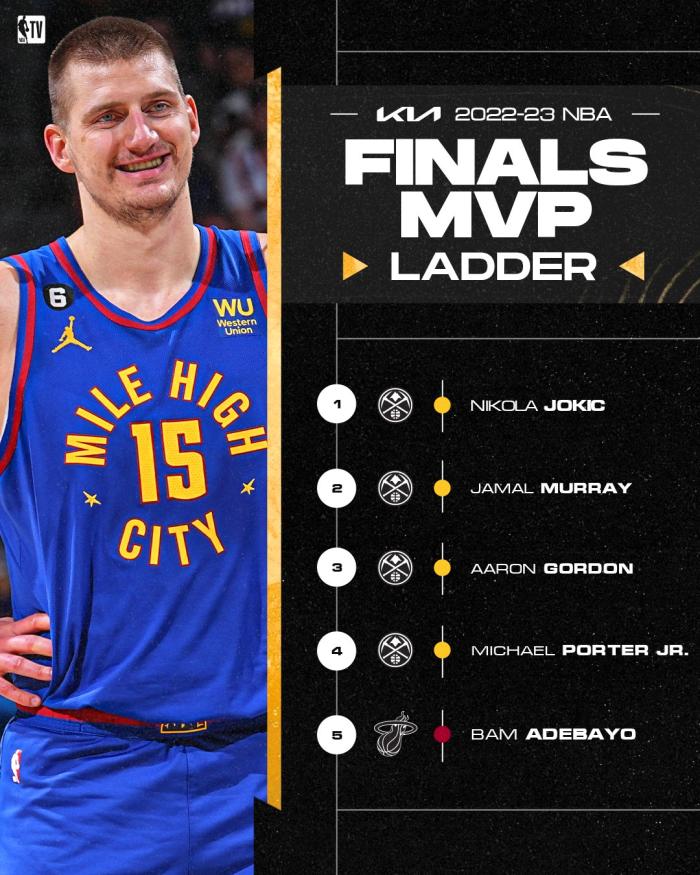 NBA官网更新FMVP排名,排在前五的球员依次是约基奇、穆雷、戈登、小波特和阿德巴约;约基奇位居第一且掘金球员包揽前四,热火队仅阿德巴约排在前五,巴特勒无缘上榜。