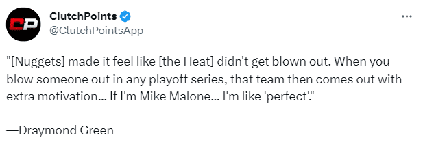 格林还表示:如果我是马龙,我走进更衣室会说,伙计们今天打得很好,我们展示了一些东西。第一,掘金赢了,第二,掘金以一种很好的方式赢下比赛。他们让人感觉热火并没有被完全击溃。当你在任何季后赛系列赛中击溃、大比分战胜一支球队时,都会给对方增加一些额外的动力。如果我是迈克-马龙,我会说,‘完美’。