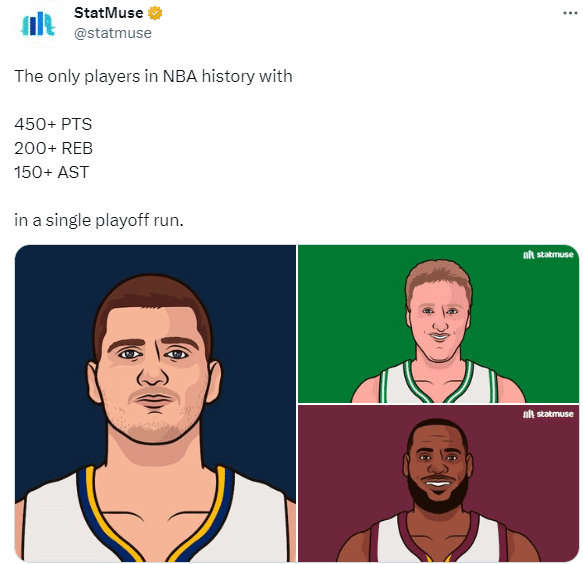 5、约基奇比肩詹姆斯和伯德成为NBA历史上第三位单个季后赛得分450+篮板200+和助攻150+的球员