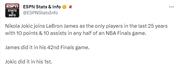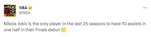 4、约基奇成为历史近25年第一位总决赛首秀半场得分和助攻都上双的球员
