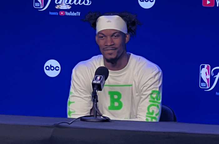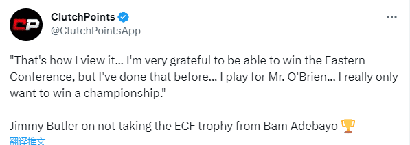 谈到拒绝捧杯的话题时,巴特勒回应:这就是我看待事情的方式,并非对阿德巴约的不尊重。能赢下东部冠军我很感激,但我之前做到过了。我真的只想夺得总冠军,我不是为了东决MVP而战,也不会为了总决赛MVP而战。我是为了奥布莱恩杯(总冠军奖杯)而战。