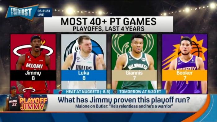 近4年季后赛,巴特勒共8次砍下40+,和东契奇并列同期联盟最多,在今年季后赛,巴特勒扮演关键先生,据统计,巴特勒在今年季后赛的关键时刻得分、抢断、单打得分,全部位列联盟第一。