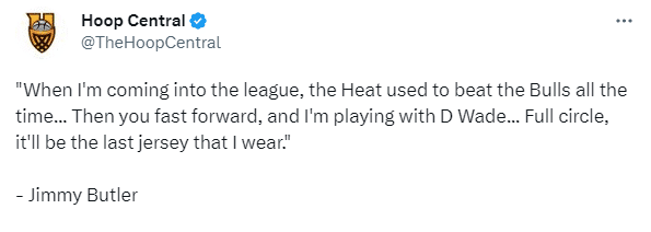 热火全队备战总决赛G1后集体接受采访,巴特勒公开表态想在热火退役,表示:在我初进联盟时,热火总是在击败公牛,那时他们拥有三巨头。然后,我又遇到了韦德,真的很难不爱他,向他脱帽致敬。兜兜转转我来到了热火,这会是我最后穿的球衣!