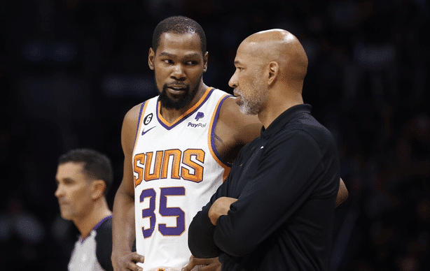 22-23赛季,太阳在交易截止日前8换2成功引援杜兰特,打造ABCD超级四巨头,季后赛首轮4-1淘汰快船,可第二轮2-4不敌掘金被淘汰出局,最终背锅被太阳老板下令解雇。