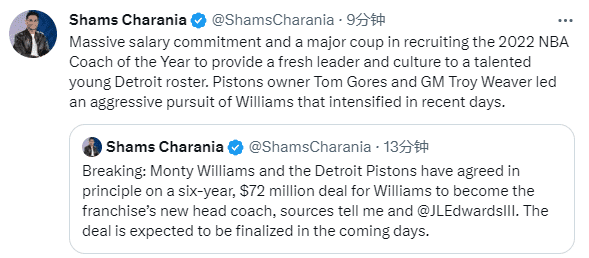 来源:JRS直播网06-01 11:35JRS直播网06月01日,太阳前教练蒙蒂再就业并且签下一份超级执教大合同,据名记shams报道,蒙蒂-威廉姆斯和活塞达成一份6年7200万美元的续约合同,将成为活塞新主帅,预计合同将在未来几天正式敲定,更多内幕曝光,蒙蒂合同最高能够达到8年1亿美元;woj跟进报道,蒙蒂已经和活塞签下6年7850万美元合同,这是历史最大执教合同。