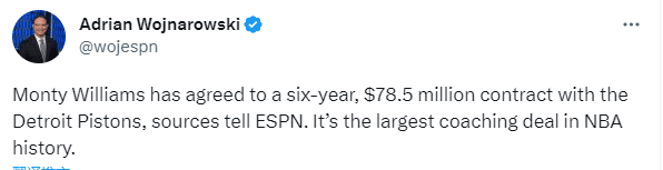 蒙蒂和活塞签下6年7200万美元的超级合同,平均年薪高达1200万美元,据美媒报道,蒙蒂年薪超越波波维奇(1150万美元)成为NBA史上年薪最高的主帅。