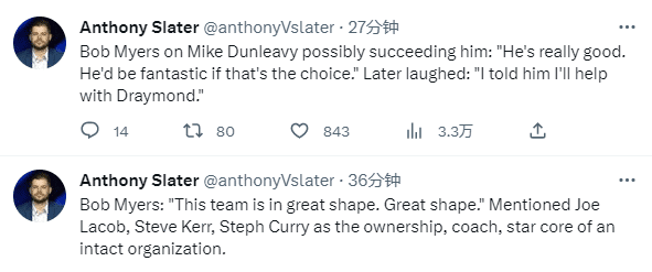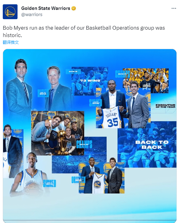 勇士四冠功臣迈尔斯正式辞职离队,勇士官方晒出迈尔斯拥抱库里的合影从而向他告别,发推写道:2次年度最佳总经理,4次总冠军,一个时代的打造者。在为球队工作11个赛季后,鲍勃-迈尔斯将在其合同结束时辞去篮球运营总裁兼总经理的职位。感谢你所做的一切。