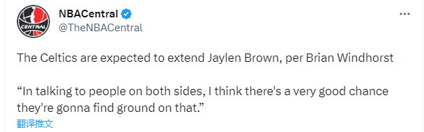 据ESPN记者Brian Windhorst报道,凯尔特人有望续约杰伦-布朗:尽管抢七很艰难,但在和双方人员交流时,我感觉他们有很好的的机会在这件事情上找到一致的立场。