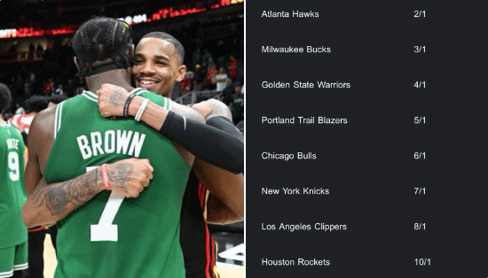 布朗肯定想要顶薪,若双方续约失败,布朗可能申请离队;布朗潜在下家最新赔率出炉,若布朗离开凯尔特人,老鹰赔率1赔2、雄鹿1赔3、勇士1赔4、开拓者1赔5、公牛1赔6、尼克斯1赔7、快船1赔8和火箭1赔10以及掘金1赔12。