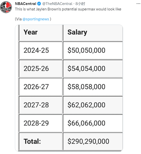 潜在顶薪的合同细节提前曝光——24-25赛季5005万美元,25-26赛季5404万美元,26-27赛季5806万美元,27-28赛季6206万美元和28-29赛季6607万美元,5年合同总额超过2.9亿美元。