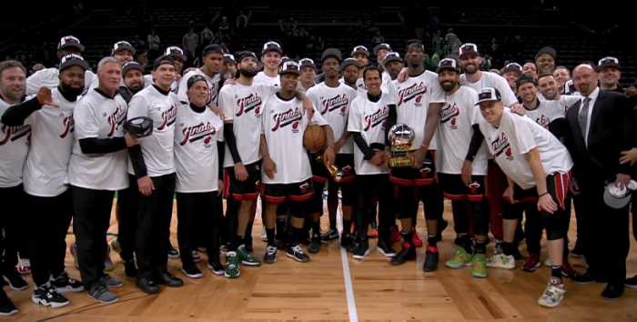 东部冠军合影出炉!巴特勒C位抱MVP奖杯 险胜马丁首夺东决MVP