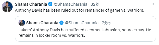据报道,湖人总经理佩林卡前往更衣室查看浓眉的伤情;湖人上半场落后勇士1分,下半场湖人被迫变阵,海斯顶替浓眉首发;之后湖人官方宣布浓眉本场比赛不会回归。据报道,浓眉的眼角膜擦伤。