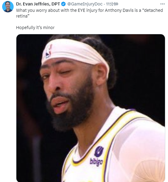 浓眉上半场仅仅只打了11分钟,6投3中拿到8分4篮板2助攻,离场后一直留在更衣室,对于浓眉的伤情,医学专家Evan Jeffries担忧浓眉的视网膜脱落,并且希望他的伤势无大碍。