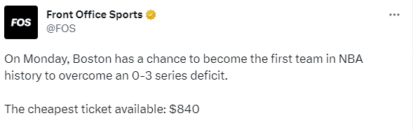 凯尔特人替补席后面的座位售价已经超过18000美元,绿军和热火东决G7的场边座位更是一票难求,场边VIP票价可能超过2万美元。
