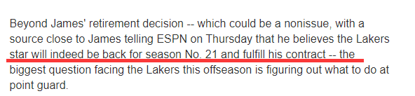 据ESPN名记Dave McMenamin报道,一名詹姆斯身边的消息人士表示,他相信詹姆斯会回归继续征战生涯第21个赛季,同时继续履行剩余2年9710万美元的合同,第二年拥有球员选项。