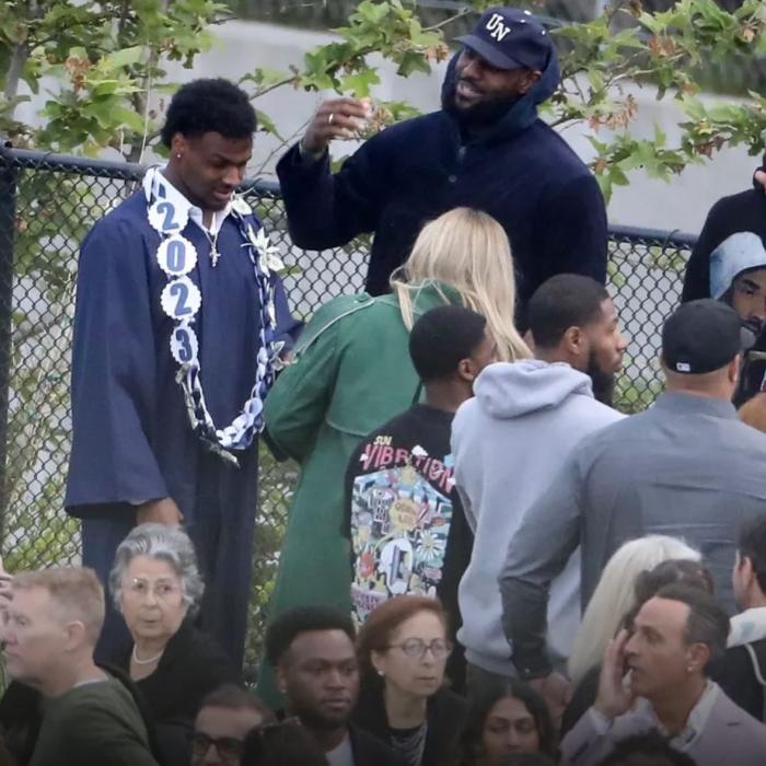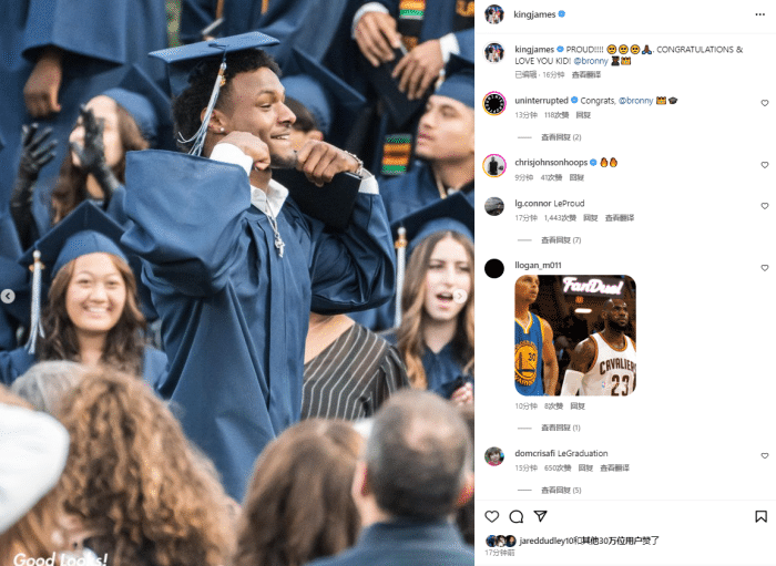 这是湖人在西决被掘金4-0横扫后,詹姆斯首次在公众场合亮相,开心地参加布朗尼的毕业典礼;值得一提的是,布朗尼是詹姆斯家中的第一个大学生,他已经签约南加州大学,最快将在2024年参加NBA选秀。
