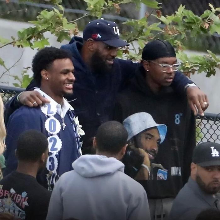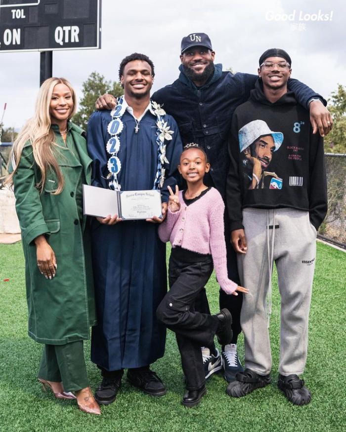 在詹姆斯全家福中,詹姆斯搂着布朗尼和布莱斯两个儿子,小女儿站在老詹的前面,萨瓦娜则是站在布朗尼身旁,一家五口十分幸福;布朗尼展示自己的毕业证书,布莱斯身穿印有科比头像和8号、24的连帽卫衣,而且布莱斯要比布朗尼高一些。