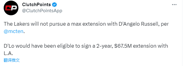 2年6750万美元的提前续约合同,但湖人不会给他这份顶薪续约合同;若双方未能达成协议,拉塞尔将成为自由球员。