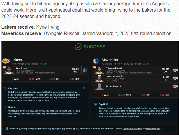 美媒Lakers Daily列出一笔送出拉塞尔并且引援欧文的交易方案,湖人如何成功达成先签后换引援欧文的交易?具体交易方案是——湖人送走拉塞尔、范德比尔特和2023年首轮选秀权(17号签),从独行侠得到欧文。