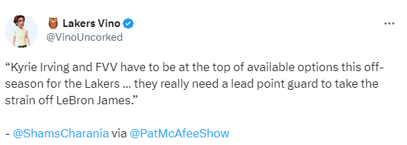“控球后卫位置上,拉塞尔拿着顶薪合同替补出场,所以湖人会升级控卫,目标是凯里-欧文和范弗里特,我并不是说他们中的任何一个会加盟湖人,但我认为如果你是湖人队的一员,你必须考虑这两个人,他们在湖人的名单上名列前茅。