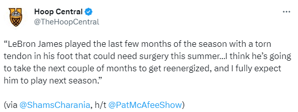 谈到詹姆斯考虑退役的话题,shams表示:我完全相信詹姆斯会出战下赛季,他的孩子们将为他带来活力。