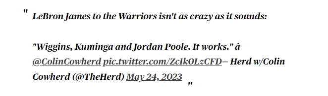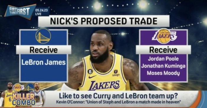 福克斯体育名嘴Colin Cowherd在节目中提出了詹姆斯与勇士队的潜在交易,他认为这将对两队都有利,他提出的交易方案是湖人把詹姆斯交易到勇士,从勇士得到维金斯、库明加和乔丹-普尔。