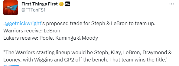 另外名嘴Nick Wright也列出詹姆斯1换3交易方案,勇士得到詹姆斯,湖人得到普尔、库明加和穆迪,勇士的首发阵容将是库里、詹姆斯、克莱、格林和鲁尼,维金斯和小佩戴替补,这支球队将赢得总冠军。