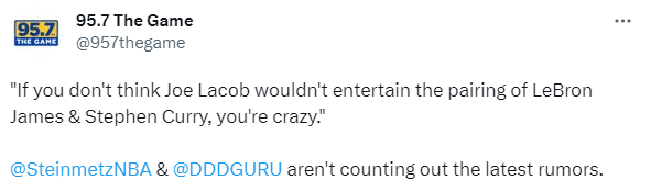 NBA记者steinmetz谈到詹姆斯加盟勇士的流言,表示:如果你认为乔-拉科布不会喜欢勒布朗-詹姆斯和斯蒂芬-库里的搭档,那你就疯了。
