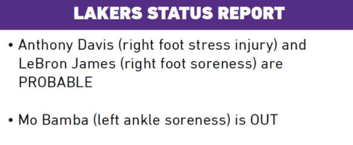 来源:JRS直播网05-20 09:48JRS直播网讯05月20日,湖人官方公布西决G3伤病报告,詹姆斯(右脚酸痛)和浓眉(右脚伤病)继续被列为大概率出战,班巴(左脚踝酸痛)继续缺席比赛;詹姆斯左脚踝伤势无碍,预计继续带伤出战;湖人夺冠概率仅有10.3%,哈姆G3会再次变阵吗?