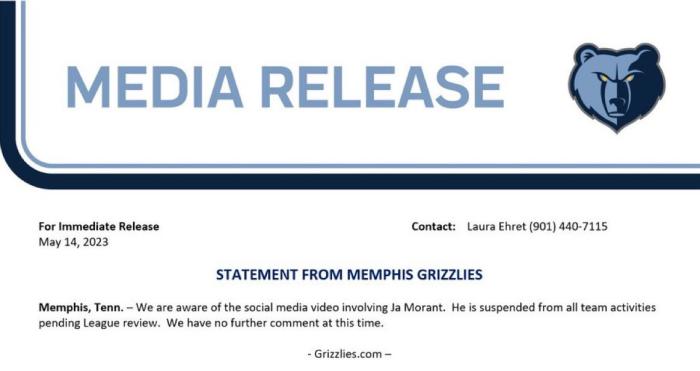 当时莫兰特声明:我为我昨晚的行为负全部责任,我要向我的家人、队友、教练、球迷、合作伙伴、孟菲斯市和球队道歉,我让你们失望了。我要花点时间去寻求帮助,学习更好的方法来应对压力,改善我的整体健康状况。