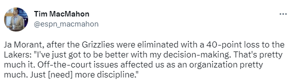莫兰特又在场外惹事,ESPN记者Tim MacMahon挖出了此前莫兰特的赛季总结,本赛季季后赛首轮G6在40分不敌湖人后,莫兰特当时表示:我需要在决策方面做得更好,基本上就是这样。场外问题也对我们这个组织影响很大,只是需要更多的纪律性。