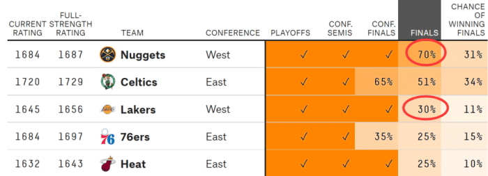 至于系列赛会持续几场,7场最被看好,随后依次是6场、5场和4场。知名大数据网站FiveThirtyEight明显更看好掘金,目前掘金晋级总决赛的概率是70%,湖人是30%。