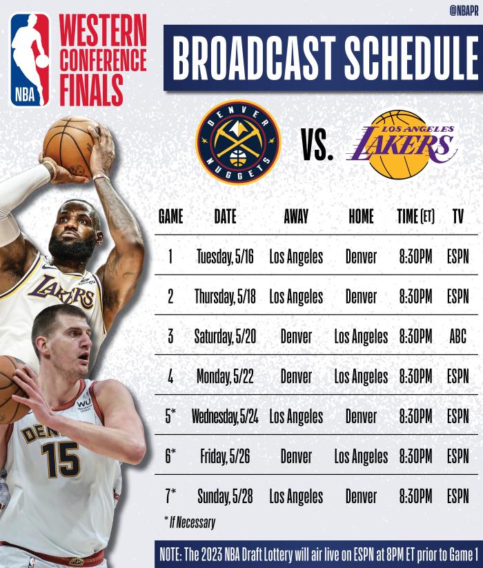两队的具体赛程也随之出炉(北京时间):5月17日G1 掘金主场 早上8:30;5月19日G2 掘金主场 早上8:30;5月21日G3 湖人主场 早上8:30;5月23日G4 湖人主场 早上8:30