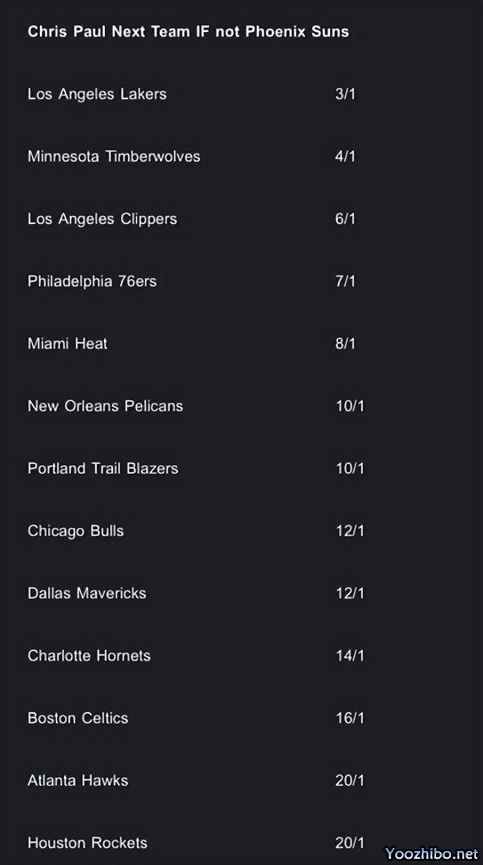 来源:JRS直播网05-13 11:42JRS直播网05月13日,名记Tim MacMahon报道称,太阳预计将在今年夏天积极兜售克里斯-保罗,保罗下赛季很可能会在一支不同的球队打球。 保罗本人回应交易流言,而他的最新下家赔率出炉:湖人成为头号热门。CP3有望联手好友詹姆斯再冲冠?