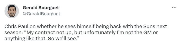 本赛季常规赛,保罗场均13.9分4.3篮板8.9助攻,季后赛场均12.4分5篮板7.4助攻。受到伤病困扰,他缺席了西部半决赛的G3-G6的4场比赛,太阳最终2-4被掘金淘汰。保罗的合同将在北京时间6月29日转为全额保障,合同的保障部分将由1580万增加到3080万美元。