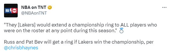 来源:JRS直播网05-09 09:48JRS直播网05月09日,据名记Chris Haynes报道,湖人总经理佩林卡已经确认,若湖人本赛季夺冠,他们将为本赛季在任何时刻效力过球队的球员颁发总冠军戒指,这意味着若湖人夺冠,威少和贝弗利等湖人旧将都能收到湖人的总冠军戒指。