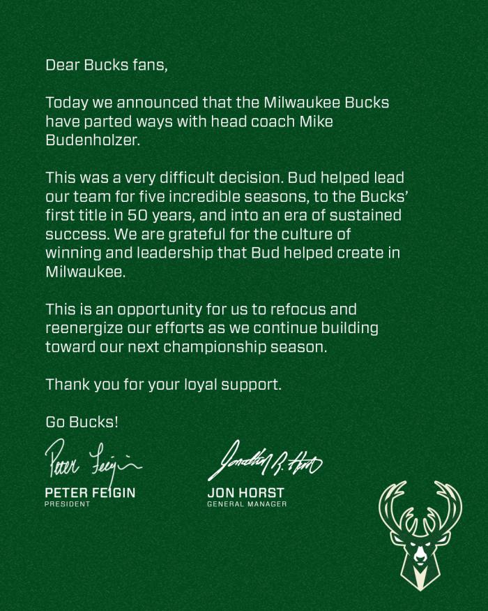 雄鹿队总经理乔恩-霍斯特声明:“做出这个改变的决定非常困难,布登帮助球队度过了五个不可思议的赛季,赢得了雄鹿50年来的第一个冠军,并进入了一个能够持续保持竞争力的时代,我们感谢他在密尔沃基创造的赢球文化和领导力。”