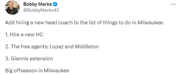 名记Bobby Marks列出雄鹿今夏要做的事——1、聘请一位新的主教练;2、自由球员大洛佩兹和米德尔顿的续约;3、字母哥的提前续约;雄鹿迎来一个很大的休赛期。