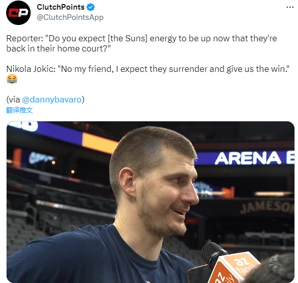 目前掘金大比分2-0领先太阳,当被问及是否可以在菲尼克斯偷取一场客场胜利时,约基奇反问道:“为什么是一场?”记者随后问道:“你认为太阳队回到主场后,他们的能量会有提升吗?”约基奇打趣道:“不,我的朋友,我希望他们能投降,让我们获胜。