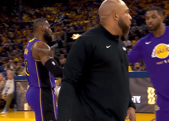 湖人0-4开场落后,詹姆斯本场第一次尝试三分就稳稳命中,之后里夫斯和拉塞尔输送火力与勇士对攻,J-格林命中底角三分后,詹姆斯空切高抛得分,之后轰进追身三分,连得5分打停勇士,此时老詹露出霸气的发狠表情。
