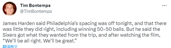 哈登则表示球队今天场上空间不好,而且球队几乎没有做得好的方面,包括拼抢五五开的球;此外哈登还表示,球队达成了前两个客场的目标(至少赢一场),并且在回看录像后,球队会解决问题,会打出好的表现。