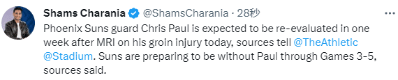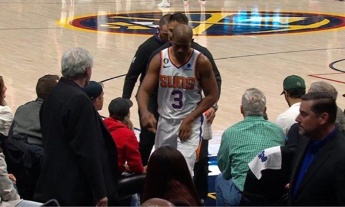 在太阳和掘金西部半决赛G2第三节5分多钟,保罗在禁区和波普争夺篮板时不幸受伤,腹股沟受伤后捂着裆部返回更衣室接受检查,之后太阳官方宣布,保罗因腹股沟紧张退出比赛;保罗伤退后太阳崩盘,末节被掘金打出21-8攻势,最终太阳输掉G2,系列赛总比分0-2落后陷入困境。